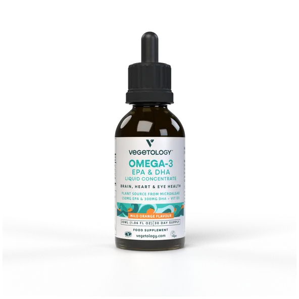 - Konsentrert plantebasert Omega-3 fra mikroalger. 150 mg EPA og 300 mg DHA + vitamin D3 på bare 1 ml